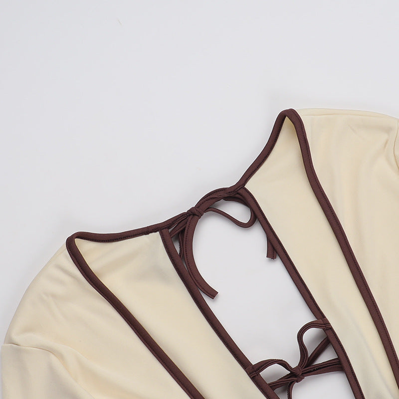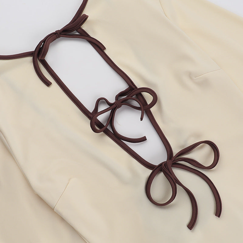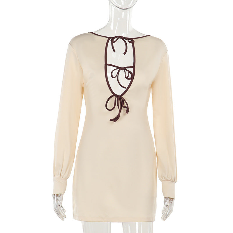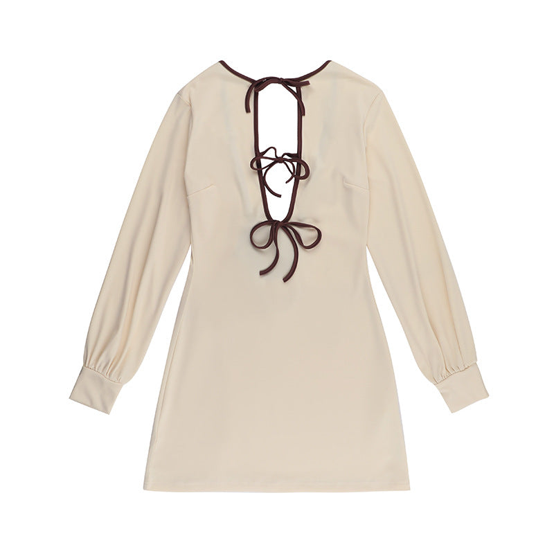 Minišaty s dlouhým rukávem vyrobené z měkkého polyesteru. S výraznými mašlemi vpředu a řetízkem v pase s perlami v sobě spojují nenápadný luxus s výrazným prvkem. Ideální na večeře, schůzky a stylové focení.