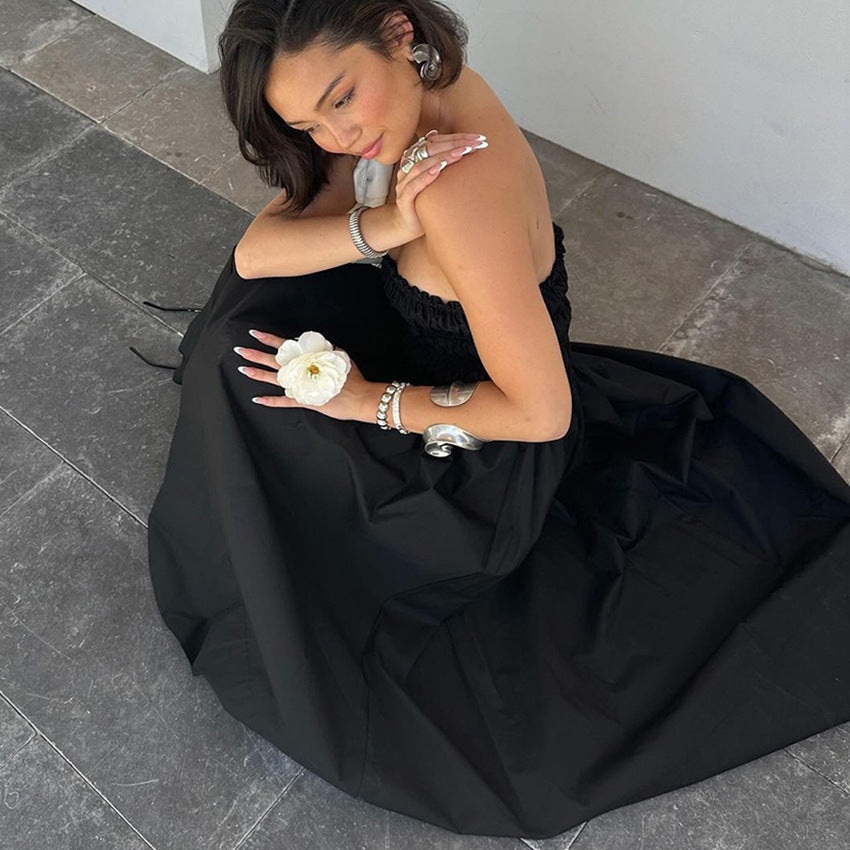 A timeless strapless black maxi dress crafted from soft, breathable fabric with a ruched bodice for a flattering silhouette. This elegant piece flows effortlessly to the ankles, perfect for evening strolls, rooftop dinners, or any summer soirée where style and comfort meet.